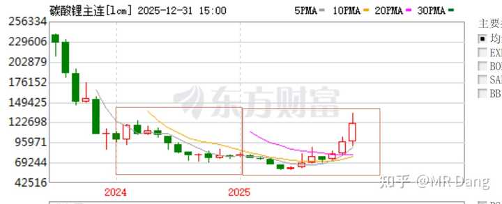 以碳酸锂的月K,即使2025年四季度走势强劲,相比2024年的均价,2025年高不了多少。