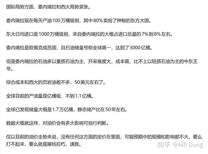 但是我要提醒大家一下,很多石化企业在委内瑞拉都有直接投资,现在西大说要接管委内瑞拉的石油,那对这些企业会有什么影响,是值得思考的一件事情。