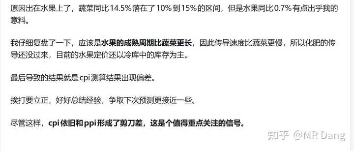 我上个月做CPI预测的时候,水果这部分和蔬菜不同步,有滞后性,当时也解释了原因: