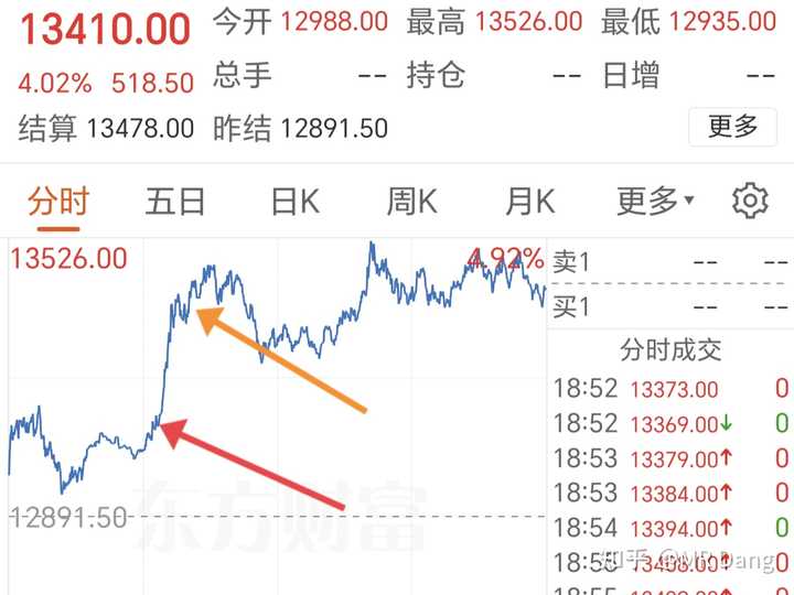 红色箭头为消息传出时间,橙色箭头为昨天股市收盘时间对应铜价。
