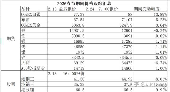 其他商品期货价格的变动,我做了个表: