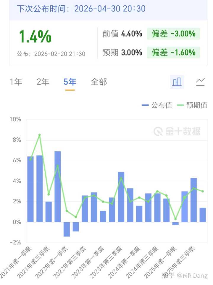 预期3.0%,实际1.4%。