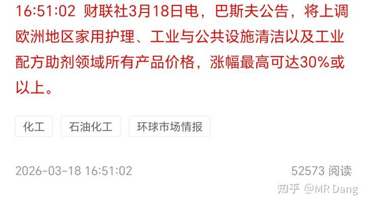 但是巴斯夫这几年也经常调价,所以最好不要当成一个很大的题材去参与,只是说借由这个引子,看有没有特别合适的企业,纳入观察,然后等它回调了很多的时候再考虑是不是有机会。